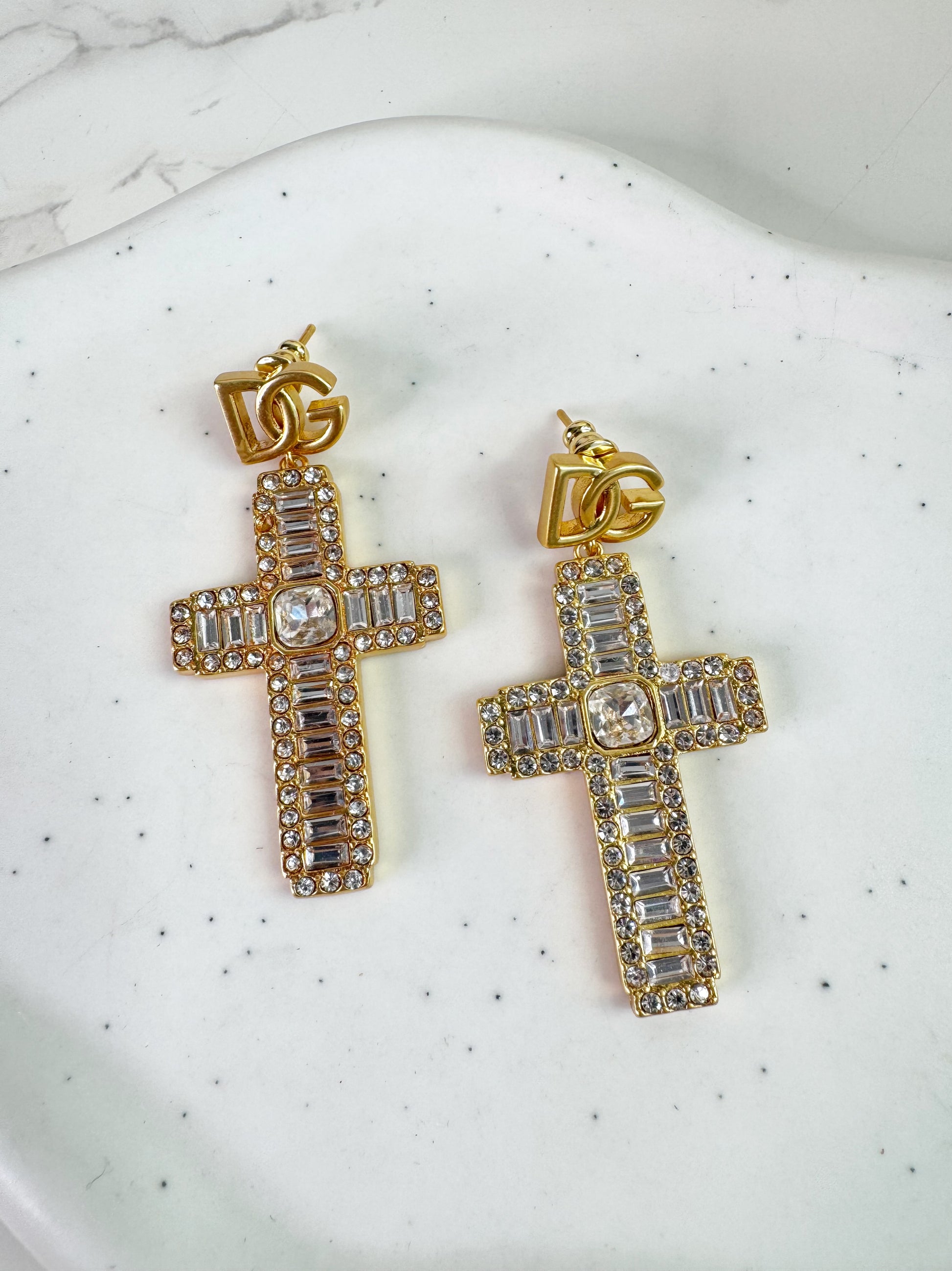 Εντυπωσιακά σκουλαρίκια σε σχήμα σταυρού, διακοσμημένα με λαμπερές πέτρες και το χαρακτηριστικό λογότυπο DG. Ένα κομμάτι που συνδυάζει κομψότητα και δυναμισμό, ιδανικό για λαμπερές εμφανίσεις.