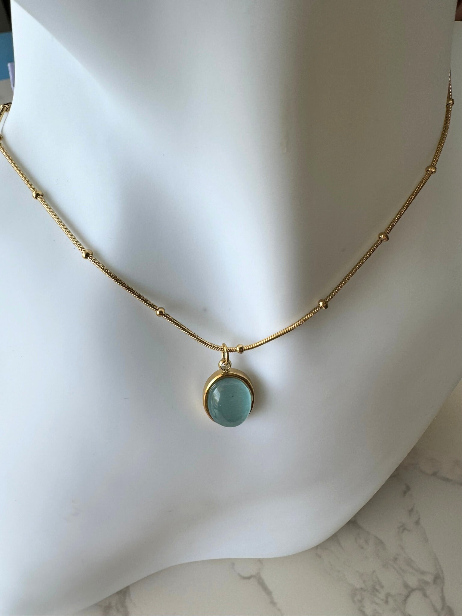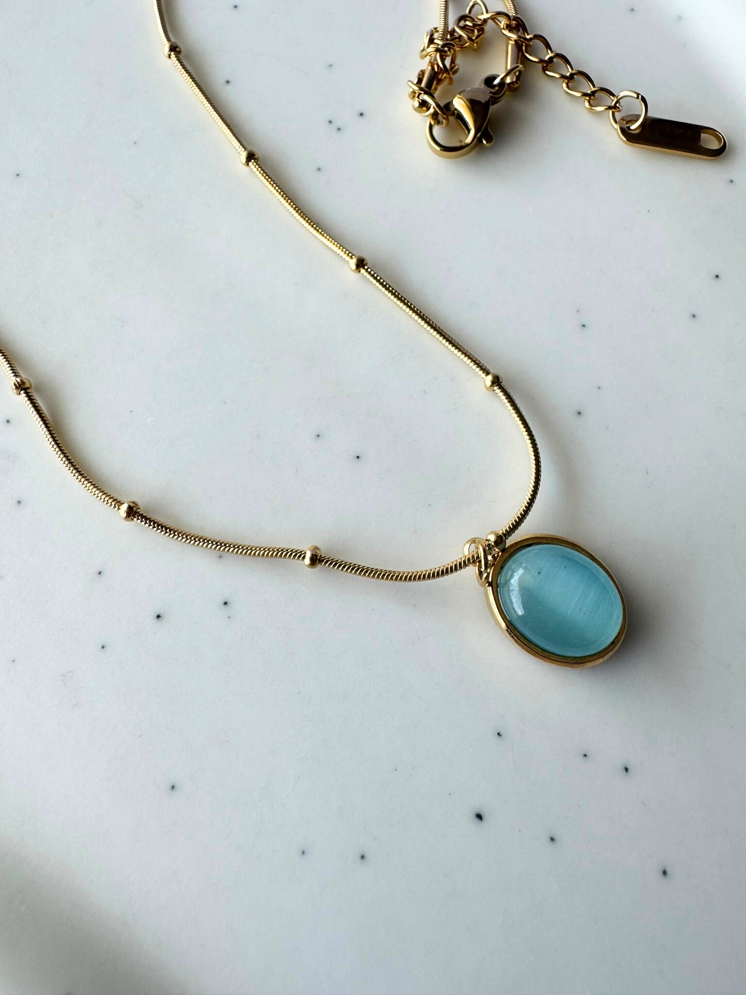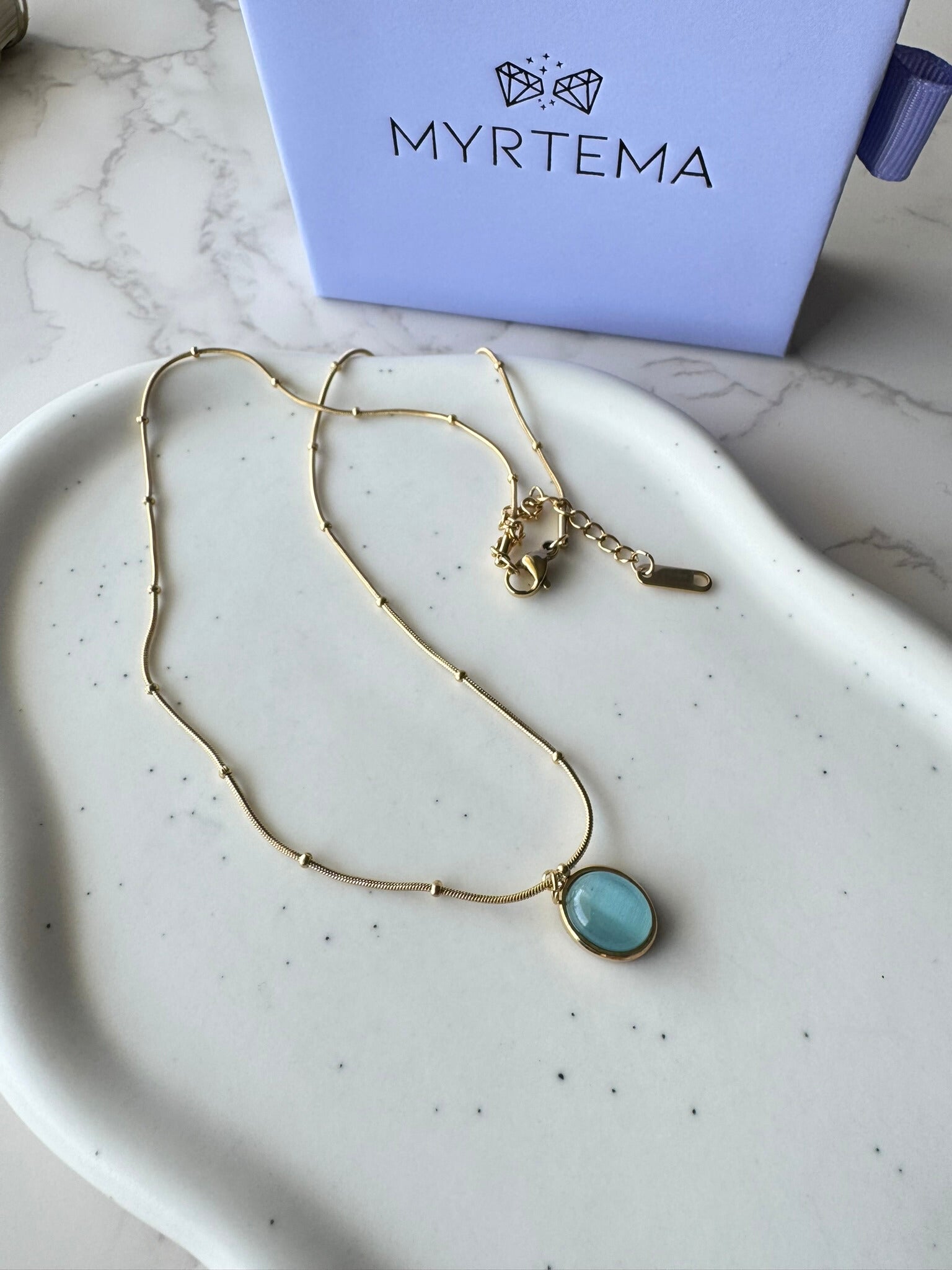Σας παρουσιάζουμε το κολιέ "Ios" ένα κολιέ που διαθέτει βάση από ανοξείδωτο ατσάλι και επιμετάλλωση χρυσού 18 καρατιών. Αυτό που το κάνει να ξεχωρίζει είναι η οβάλ γαλάζια πέτρα του, η οποία στο φως κάνει υπέροχους ιριδισμούς.