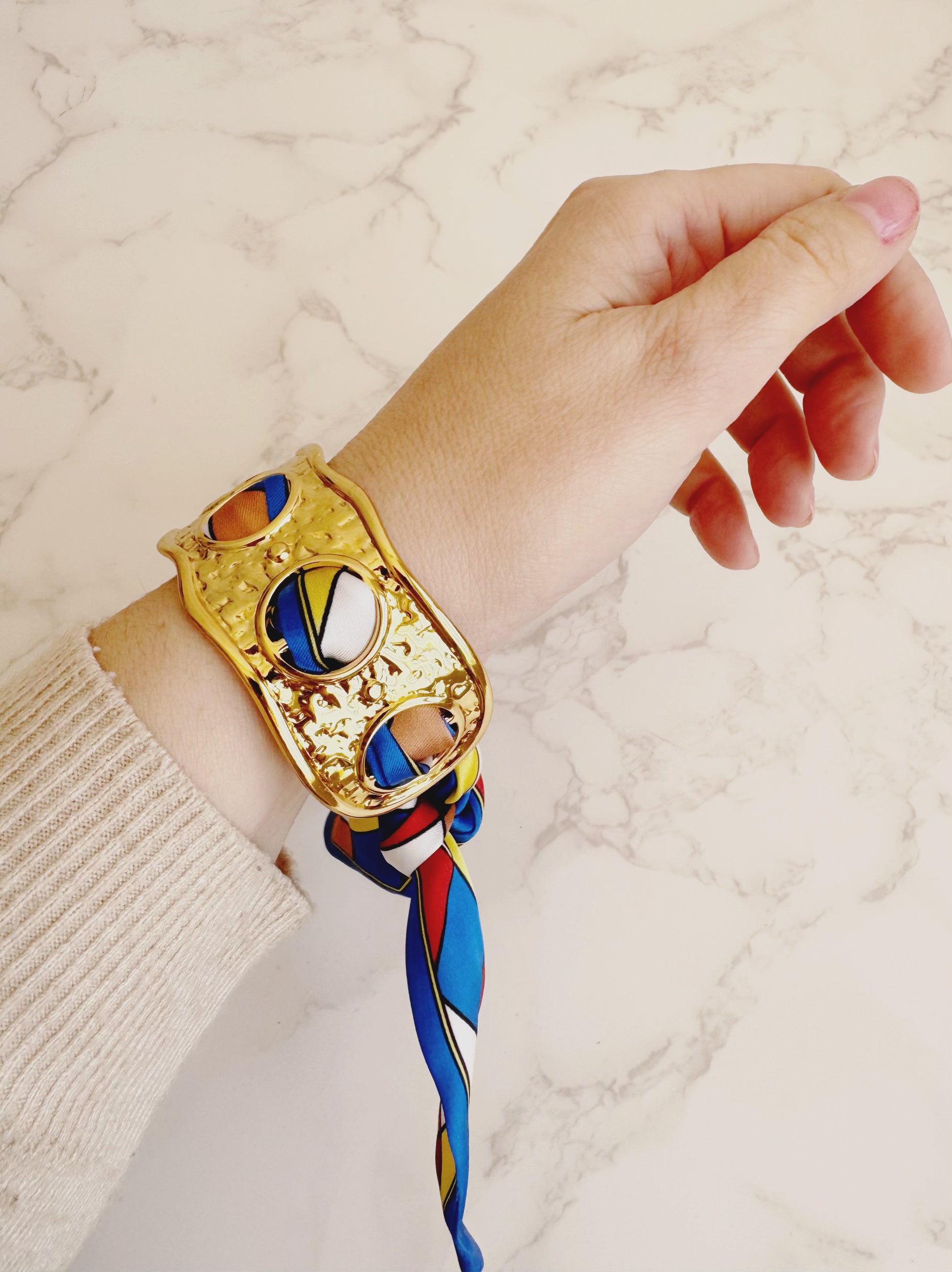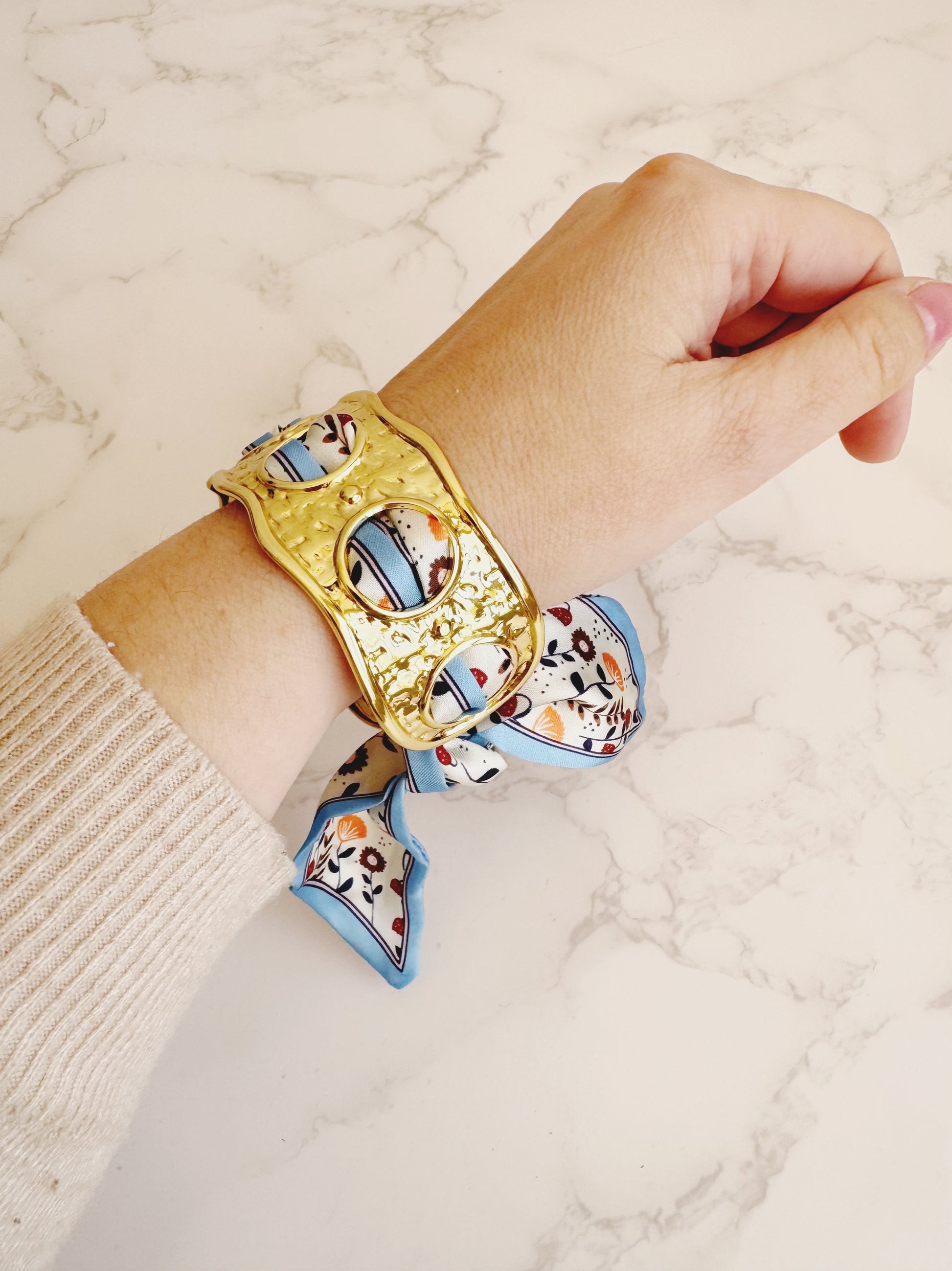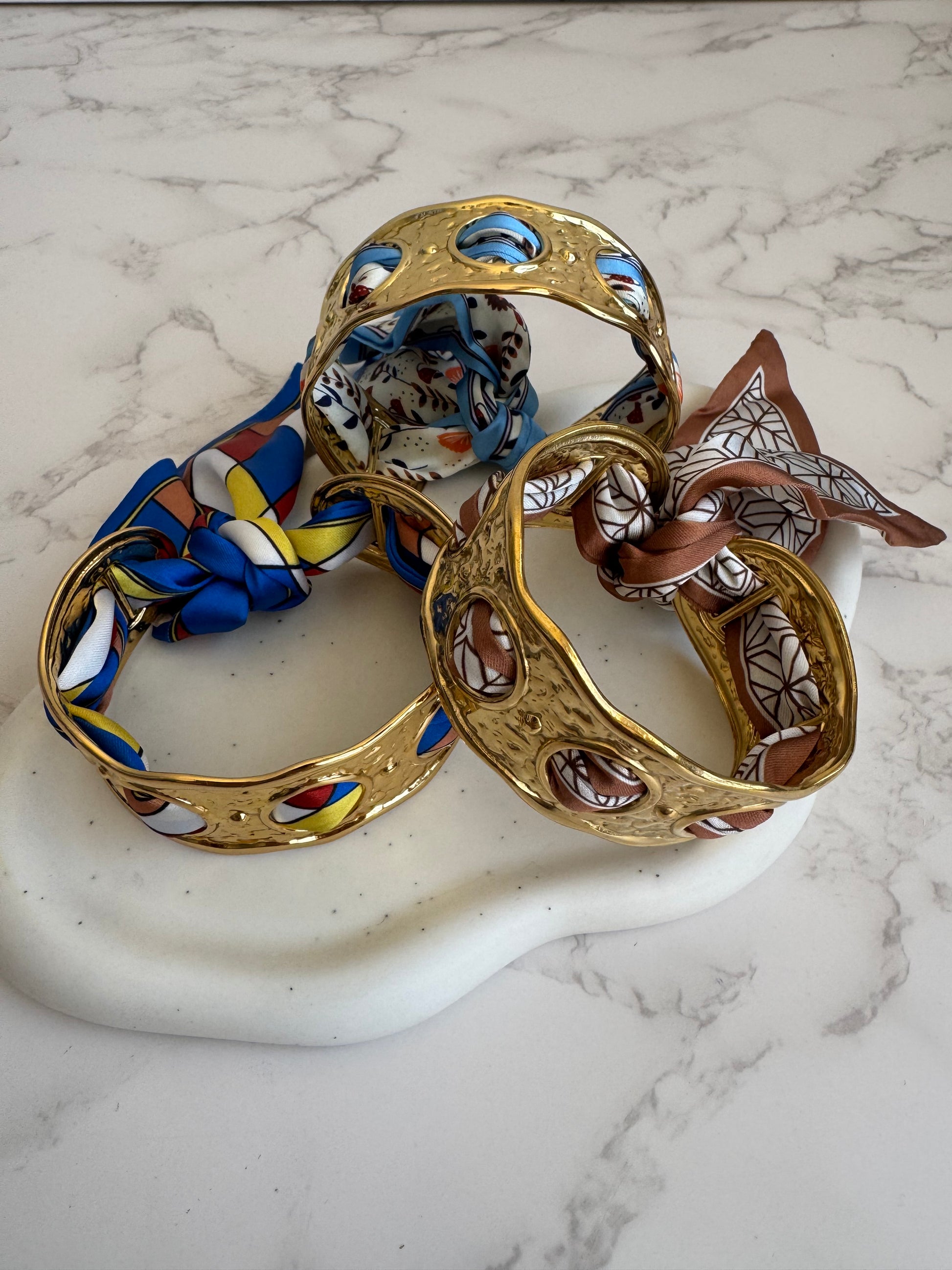 Το βραχιόλι Pilar συνδυάζουν τον μοντέρνο σχεδιασμό με την κομψότητα του μεταλλικού στοιχείου και τη φινέτσα ενός μαντηλιού που τα διακοσμεί μοναδικά. Ένα statement αξεσουάρ που προσθέτει χρώμα και χαρακτήρα σε κάθε εμφάνιση.